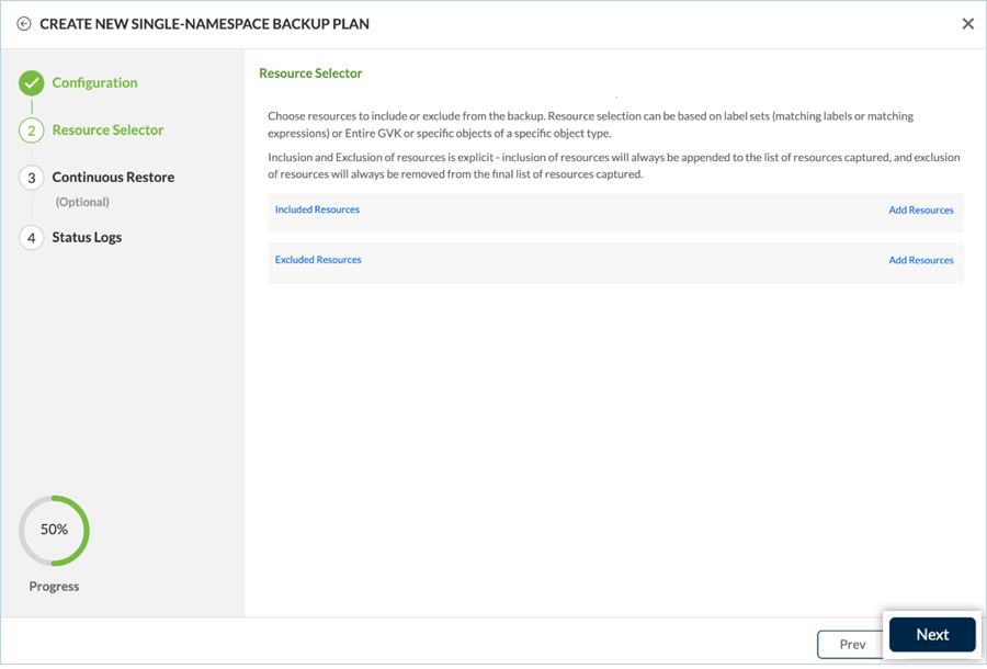- Make the desired inclusions or exclusions from Resource Selector, and then click Next.