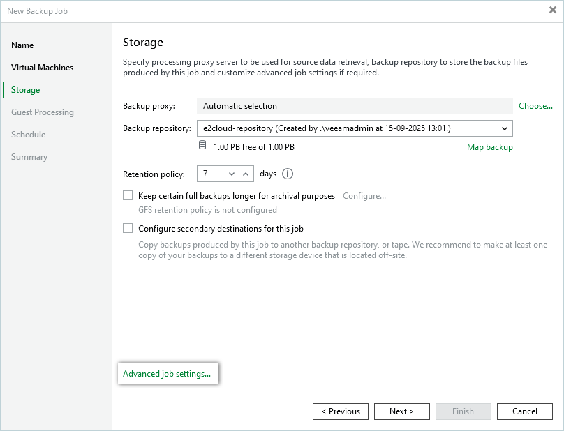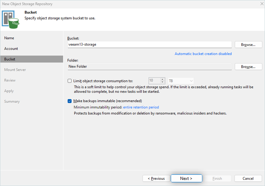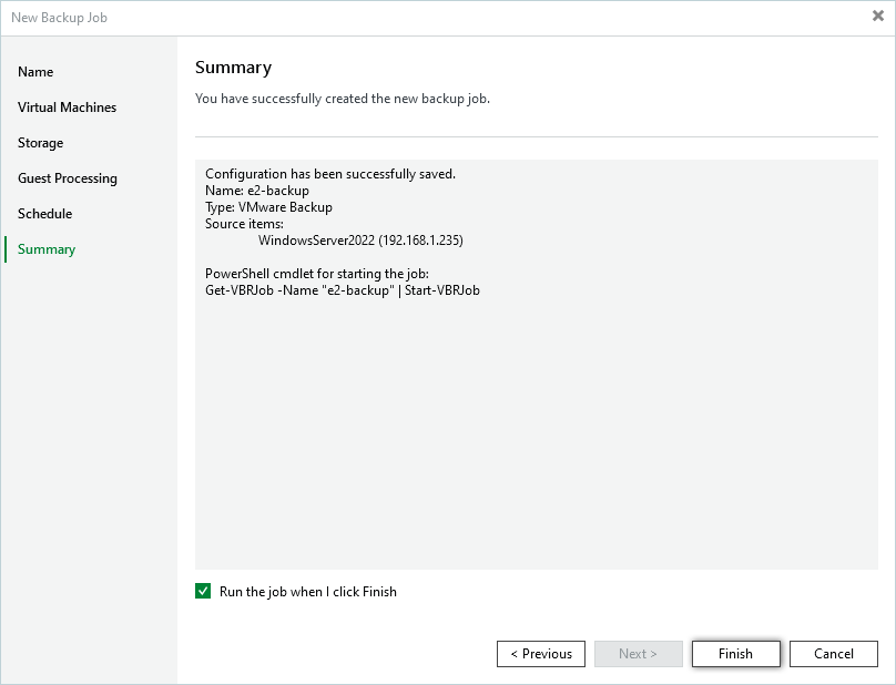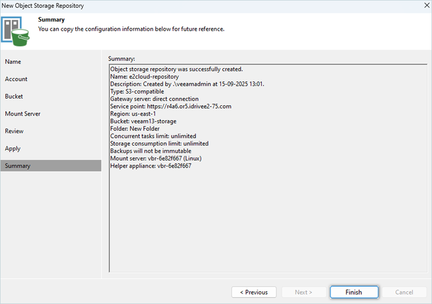 - In the Summary tab, click Finish. Your direct-to-cloud backup job to IDrive® e2 is configured with immutability!