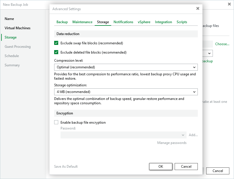 - Click Advanced and navigate to the Storage tab. Set Storage optimization to 4MB, and click OK.