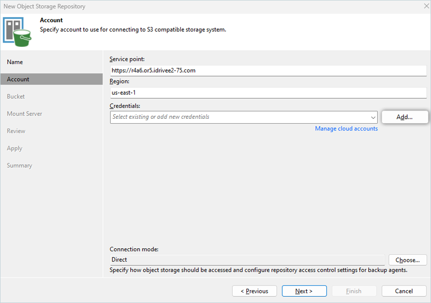 - Input the IDrive® e2 Endpoint URL under Service Point, Region, and click Add. Learn more about regions and endpoints.