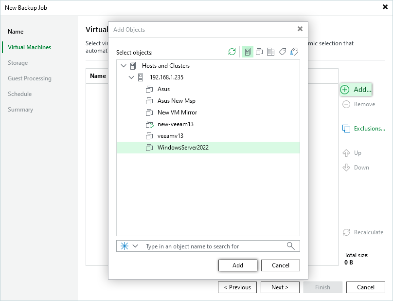 - Select the virtual machine(s) to be backed up and click Add. Repeat to add more VMs.