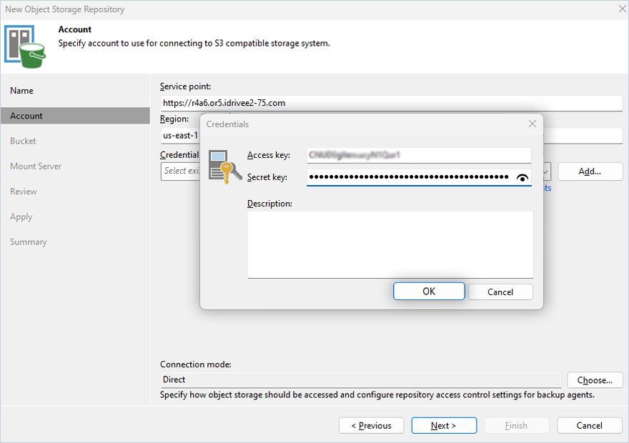 - Input the IDrive® e2 Access Key and Secret Key and click OK. Learn more about Access Keys